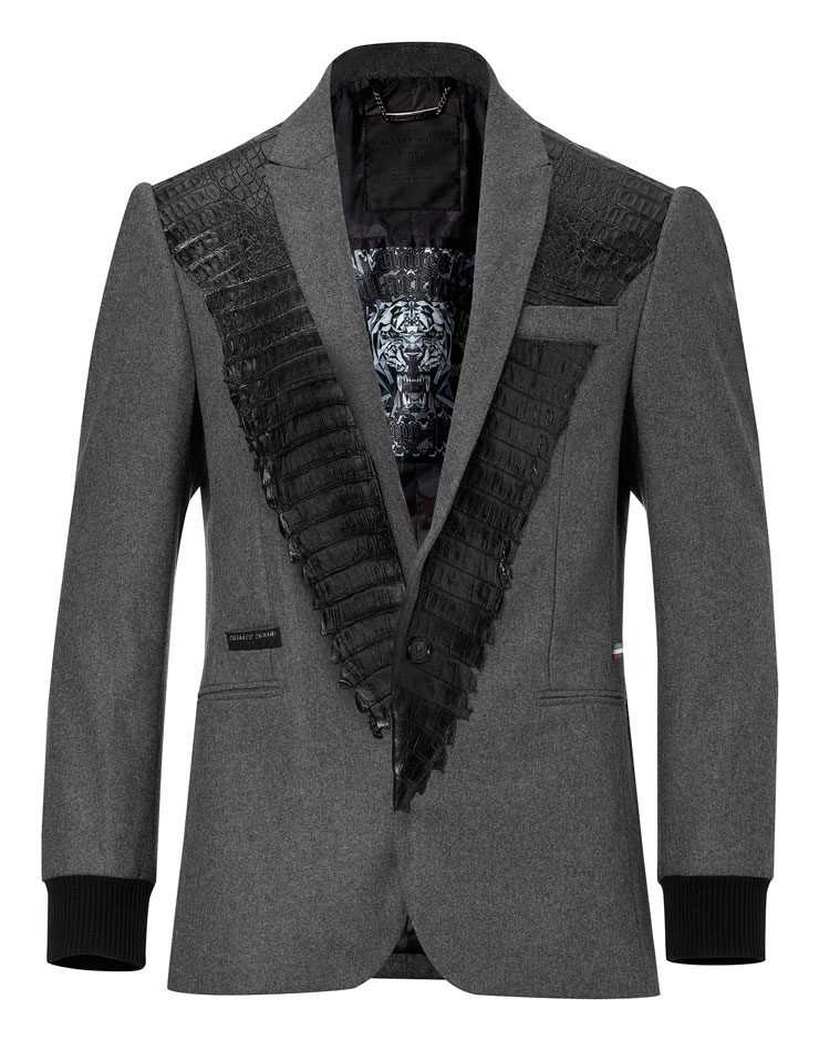 Sometimes you can’t afford looking too simple and moderate. Just for such occasions casual jackets by a German designer Philipp Plein were created. The grey wool single-breasted jacket is decorated with the genuine crocodile leather patches for “wow-effect”. It is best to wear the jacket with a plain shirt or a trendy T-shirt.