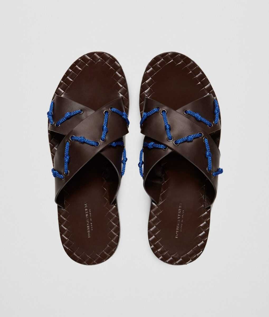 Вдохновленные яхтенной тематикой, сандалии из мягкой телячьей кожи декорированы ярко-синей шнуровкой, которая напоминает канаты. Креативный директор модного дома Bottega Veneta Томас Майер уверен, что именно такая обувь будет уместна этим летом не только на топовых курортах, но и в мегаполисах