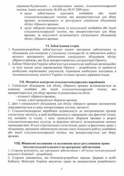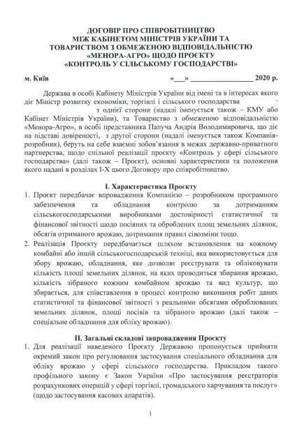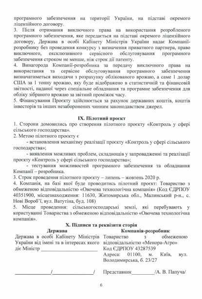 У проєкті договору обумовлено, що “винагорода компанії-розробнику за передачу виключно права на програмне забезпечення та його сервісне обслуговування буде визначатися, виходячи з розрахунку врахованого врожаю, а саме 1 долар за одну тонну врожаю, що буде відображено в статистичній та фінансовій звітності”. Нагадаємо, що за останні роки середній урожай тільки зернових культур в Україні становить 70 млн тонн.