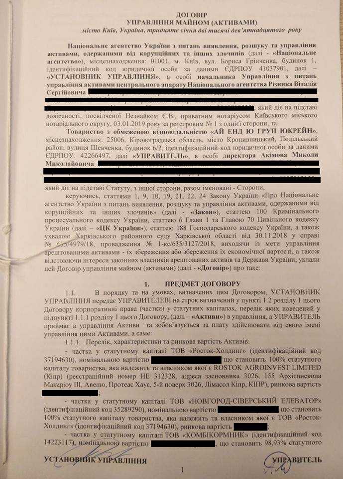 30 січня 2019 року АРМА уклало договір управління майном (активами) з ТОВ “Ай Енд Ю Груп Юкрейн”. На підставі договору передано в управління корпоративні права: 100% статутного капіталу ТОВ “Росток-Холдинг”, 100% статутного капіталу ТОВ “Новгород-Сіверський елеватор”, 98,93% статутного капіталу ТОВ “Комбікормник”.