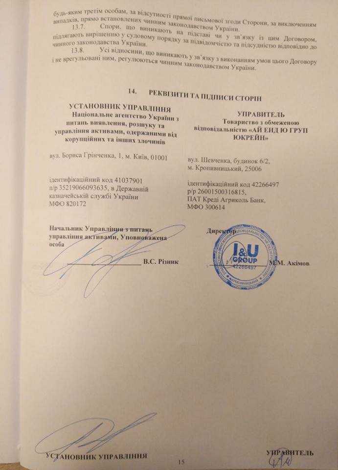 За повідомленням офіційного сайту АРМА, укладання даного договору (себто передачі «Росток-Холдингу» у тимчасову власність «Ай Енд Ю Груп Юкрейн») є завершальним етапом юридичного процесу, що розпочався на підставі ухвали слідчих суддів Харківського районного суду Харківської області від 28.09.2018 у справі № 635/4979/18.