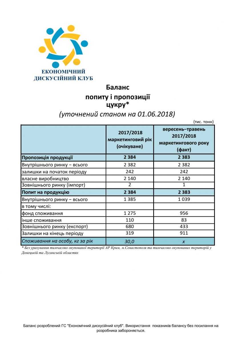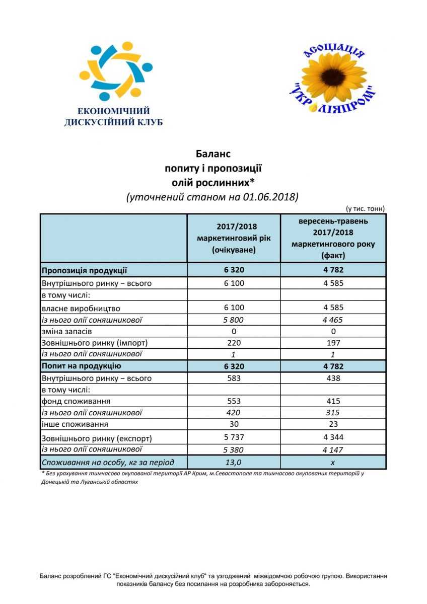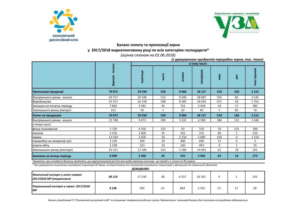 Економічний дискусійний клуб оприлюднює уточнені баланси попиту і пропозиції 5 видів продовольчих ресурсів України станом на 01 червня 2018. Згідно дослідженню, у поточному маркетинговому періоді експорт зерна, олійних рослин, бурякового цукру та м’яса впав. Ріст обсягів поставок за кордон продемонструвало тільки молоко.