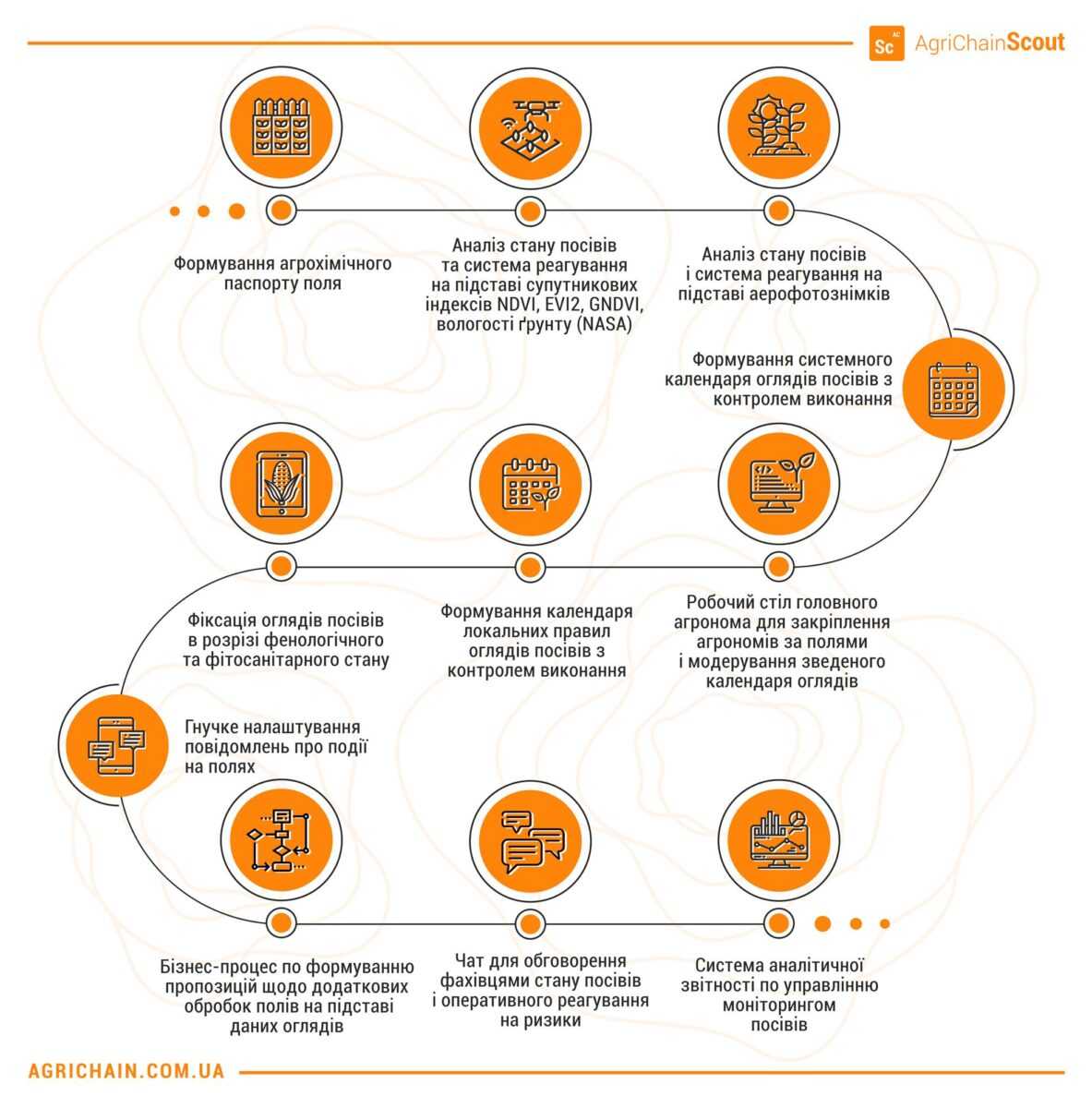 AgriChain Scout є частиною комплексної онлайн-системи для управління агробізнесом — AgriChain, яка об’єднує рішення для управління земельним банком, виробництвом, моніторингом посівів, управління складом, закупівлями та поставками ТМЦ, контроль роботи техніки та ремонтів, логістики ТМЦ та готової продукції.