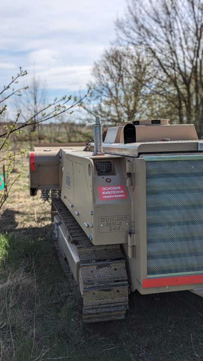 Довідка. MV-4 – легка роботизована машина розмінування та знешкодження вибухонебезпечних предметів. Завдяки низькому профілю і міцній конструкції є стійкою до детонацій протипіхотних мін та нерозірваних боєприпасів. MV-4 може витримати вибух протитанкової міни. За годину машина може розмінувати територію площею до 1500 м2. Керується пультом дистанційного керування, радіус дії якого – до 1500 метрів. Загалом у світі працює 300 систем MV-4, а в Україні на ній працюють фахівці ДСНС.