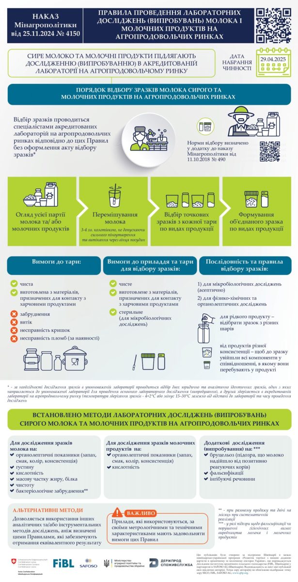 З 29 квітня в Україні запрацювали оновлені правила лабораторних перевірок молока та молочних продуктів на агропродовольчих ринках. Відтепер продаж цих товарів дозволятиметься лише за наявності ветеринарних документів та експертних висновків акредитованих лабораторій. Нововведення покликані захистити споживачів від неякісних товарів і запобігти поширенню хвороб, пов’язаних із тваринним сировином.