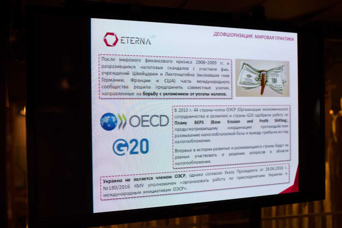 Партнером мероприятия выступила юридическая фирма Eterna Law. Олег Мальский – партнер, руководитель практики корпоративного права и M&A и Оксана Кнейчук – партнер, руководитель департамента международного налогового планирования и корпоративного структурирования, выступили с докладом на тему: «Примеры деофшоризации в СНГ и чего можно ожидать для Украины в ближайшем будущем. Практические аспекты внутренней деофшоризации и как жить в новых реалиях». Landlord публикует основные тезисы их выступления: