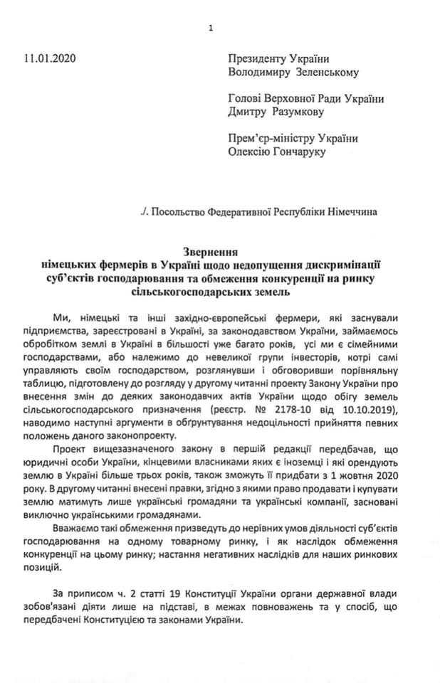 “Цим відкритим листом німецькі та західноєвропейські фермери, які займаються веденням сільського господарства в Україні, висловлюють свій протест проти дискримінації у відкритті ринку землі”, – говориться у повідомленні.