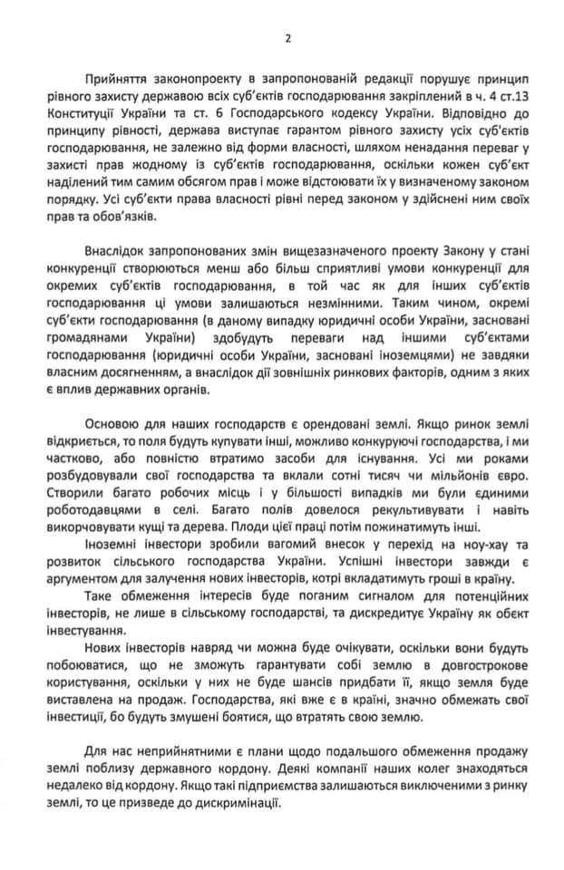 Лист підписала велика кількість іноземних фермерів-інвесторів, що працюють в Україні. Головний меседж звернення – пропозиція компромісного варіанту закону про ринок землі. Пропонується дозволити купувати землю іноземним компаніям, які працюють не менше 3 років в Україні. На думку підписантів листа, це забезпечить рівні умови для них і для українських колег.