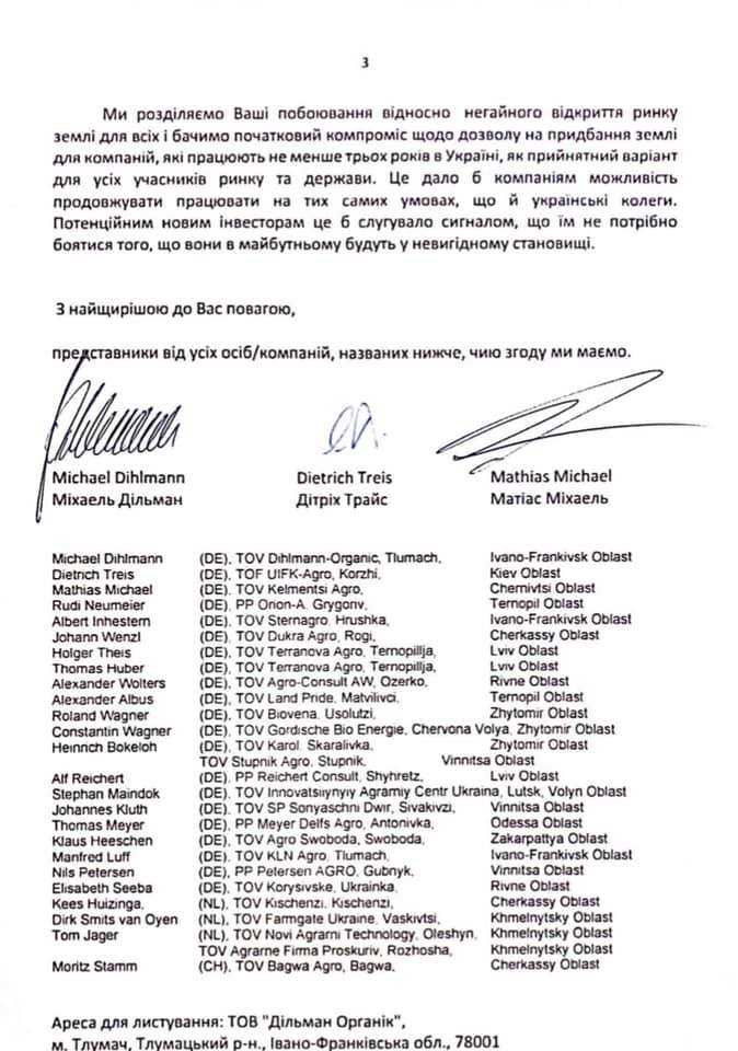 Відкритий Лист-звернення до Президента України, голови Верховної Ради України, прем’єр-міністра України та комітету Верховної ради з питань аграрної та земельної політики розмістив на своїй сторінці у Фейсбуку Міхаель Дільман, власник Дільман Органік, що успішно працює в Україні.