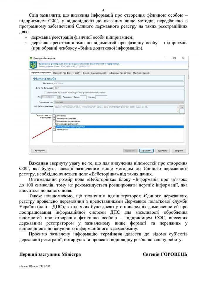 До введення в дію оновленого Єдиного державного реєстру, особи, уповноважені на вчинення нотаріальних дій, та державні реєстратори здійснюватимуть реєстрацію ФОП – голів сімейних фермерських господарств згідно з роз’ясненнями Мінюсту.