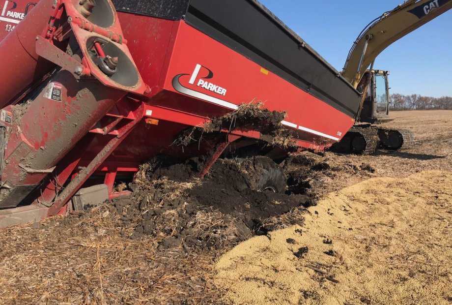 І ось нові труднощі: надмірна вологість призвела до підмивання ґрунту й утворення порожнин. Потрапляючи колесом у вирву, техніка перекидається. Як результат – зібраний урожай сої опинився на землі.