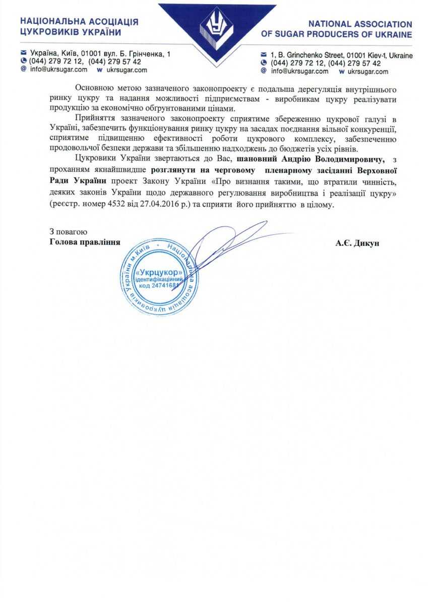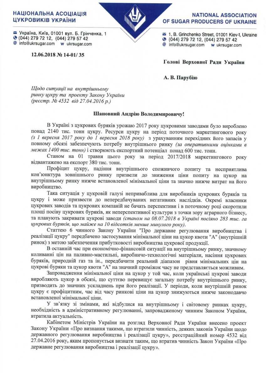 В асоціації нагадали, що законопроект №4532 «Про визнання такими, що втратили чинність, деяких законів України щодо державного регулювання виробництва і реалізації цукру» був зареєстрований в Парламенті 27 квітня 2016 року за підтримки профільного комітету, міністра та асоціації, а 17 травня прийнятий в першому читанні. Ініціаторами законопроекту виступає Національна асоціація цукровиків України та Всеукраїнська Аграрна Рада.