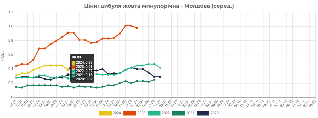 Для овочівників Молдови цибуля теж була вельми прибутковою культурою в сезоні 2023/24. До речі, це єдина країна регіону, де ціни до березня були істотно вищими, ніж під час збирання. Хоча й тут заробити на зберіганні навряд чи б вдалося.