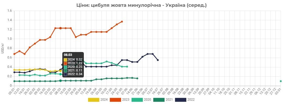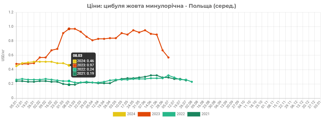 А логіка цього рішення цілком очевидна – якщо подивитися на ціни цибулі для України, Молдови та Польщі в сезоні 2023/24, то можна зрозуміти, що для виробників вони були цілком сприятливими. Для України вони були близькими до середніх значень за минулі роки.