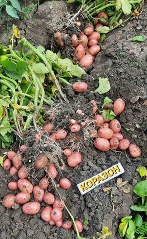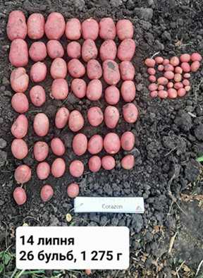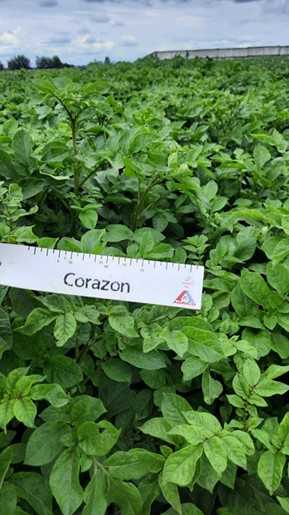 - Сорт Коразон має досить високу посухостійкість і стійкість до вторинного росту (6 балів з 8-ми), розтріскування бульб (7 балів з 8-ми). При вирощуванні без поливу в умовах 2023 року формував урожай 50-70 т/га;