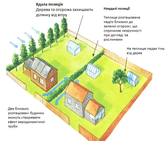 Не можна встановлювати теплицю між двома будівлями. У таких проходах зазвичай з’єднання є протяги (ефект аеродинамічної труби). Це негативно позначається на рослинах.