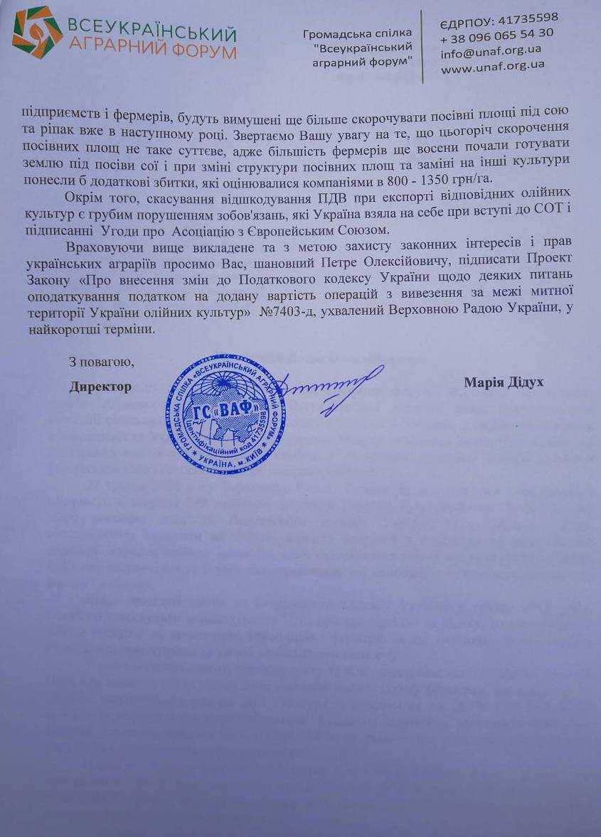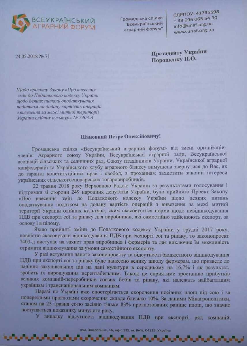 «Для вітчизняних аграріїв прийняття Верховною Радою законопроекту №7403-д є проміжним результатом довготривалої боротьби за справедливі правила гри. У випадку ветування даного законопроекту та відсутності бюджетного відшкодування ПДВ при експорті сої та ріпаку буде нанесено велику шкоду фермерам, що призведе до падіння закупівельних цін на дані культури в середньому на 16,7% і як результат, зробить їх вирощування нерентабельним. Також це сприятиме зростанню прибутків великих компаній-переробників соєвих бобів та ріпаку, які належать найбагатшим українцям і транснаціональним компаніям», – йдеться у тексті звернення.